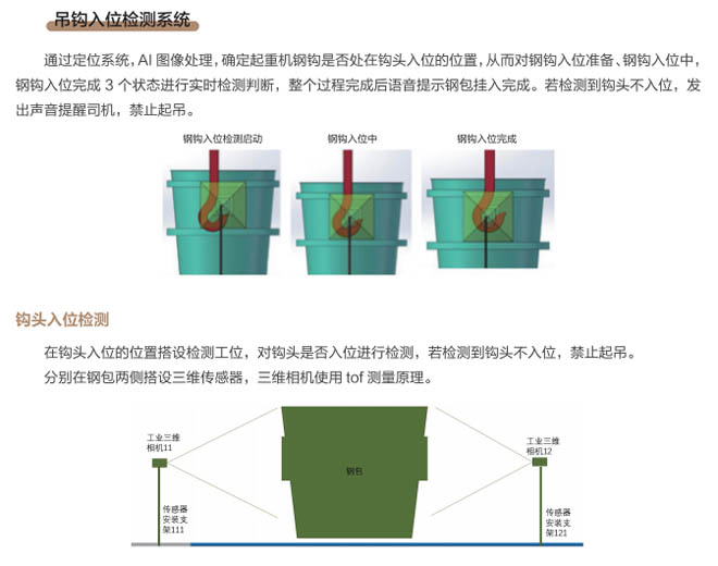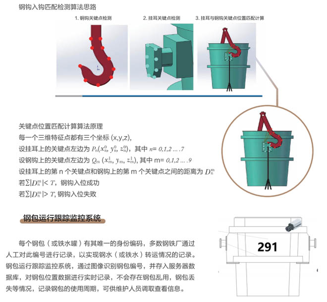 近年來,冶金行業(yè)智能化、自動化、云時代等大數(shù)據(jù)廣泛應(yīng)用,煉鋼車間是冶金行業(yè)的重點(diǎn)區(qū)域,廠區(qū)設(shè)備復(fù)雜、環(huán)境差、安全隱患多等因素更需要進(jìn)行設(shè)備自動化、智能化的升級管理、實(shí)現(xiàn)廠區(qū)無人化智慧工廠目標(biāo)的發(fā)展。起重機(jī)作為煉鋼、煉鐵、軋鋼車間的主要設(shè)備,起重機(jī)工作中對在工位操作越來越精準(zhǔn),需要駕駛員及時準(zhǔn)確觀察工位狀態(tài),由于駕駛室的位置和現(xiàn)場的工況環(huán)境影響經(jīng)常引起操作失誤,鋼包起吊安全事故頻發(fā),特別是對于鋼包掛鉤是否完整嵌入掛耳,是否進(jìn)入正確的起吊姿態(tài)沒有直接的判斷和監(jiān)控。研發(fā)起重機(jī)鋼包定位掛鉤識別管理系統(tǒng)是安全生產(chǎn)的剛性需求。