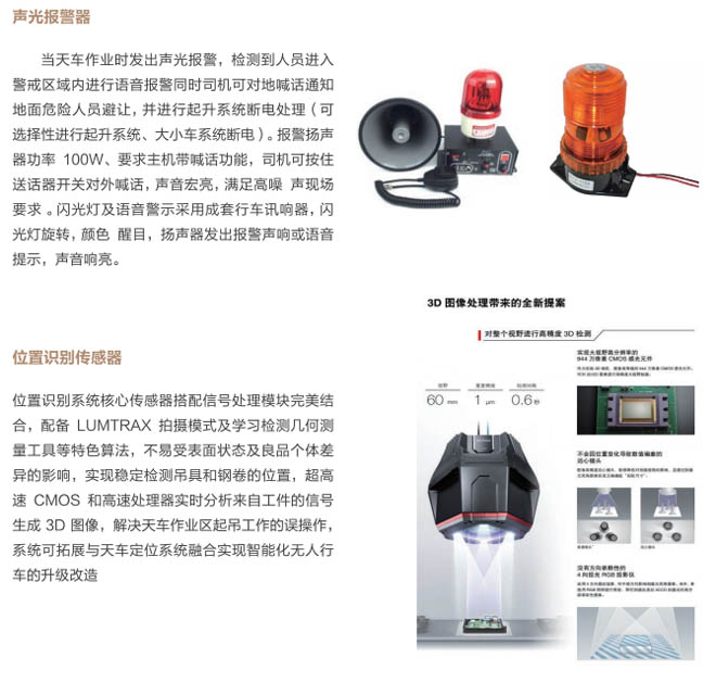 5、位置識別系統(tǒng):采用定位及位置識別最新技術(shù),通過圖像識別傳感器,識別鋼卷和吊具的位置,進(jìn)行計算和分析判斷吊具與鋼卷具備吊掛和起吊條件,進(jìn)行語音提示,系統(tǒng)具有自動識別跟蹤鋼卷與吊具的距離,操作工實時掌握清晰的位置及畫面信息,準(zhǔn)確無誤的操作,與天車定位系統(tǒng)拓展能達(dá)到自動起吊,最終實現(xiàn)智能化、無人化行車的升級改造。該系統(tǒng)能極大的減少操作人員的誤操作,給生產(chǎn)及安全提供有力保障,提高生產(chǎn)效率及設(shè)備安全性。