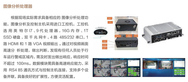 6、行車智控系統(tǒng):控制系統(tǒng)采用一體化模塊集成設(shè)計, 通過各子系統(tǒng)信號采集及圖像分析進(jìn) 行智能處理,快速準(zhǔn)確判斷各功能模 塊的異,F(xiàn)象,與主機PLC控制系統(tǒng) 通訊連接具備自動進(jìn)行報警、減速、斷電停車等功能,當(dāng)系統(tǒng)確認(rèn)發(fā)出信號指令后,控制系統(tǒng)和行車PLC連鎖進(jìn)行斷電處理,避免事故發(fā)生。